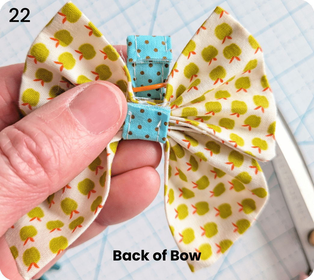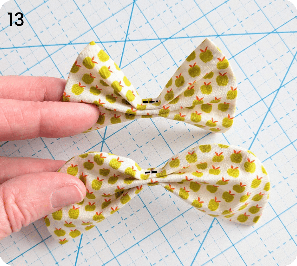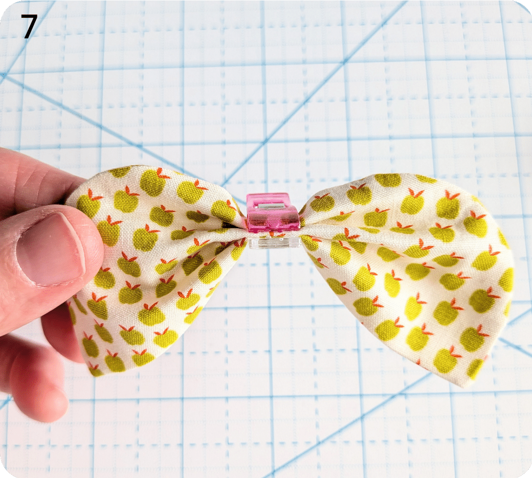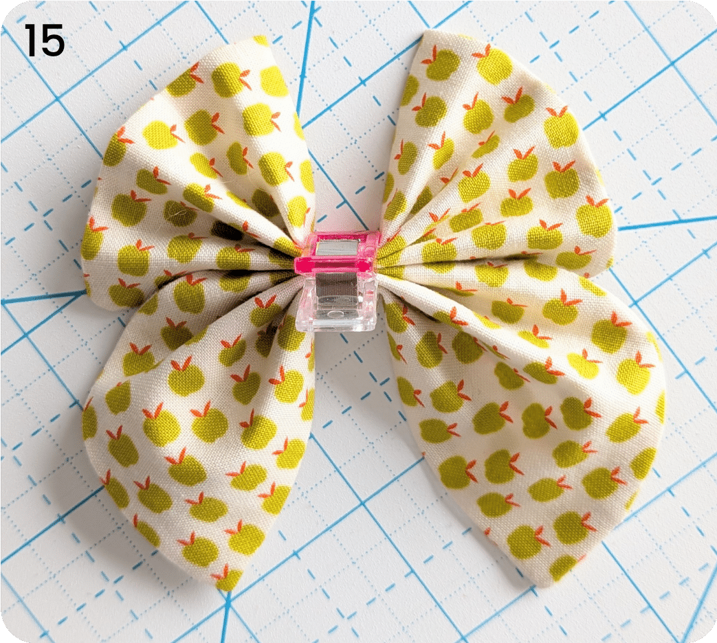 With the center mark on top, bring the Bow Body to your sewing machine and sew a few stitches, securing all the folds in place.