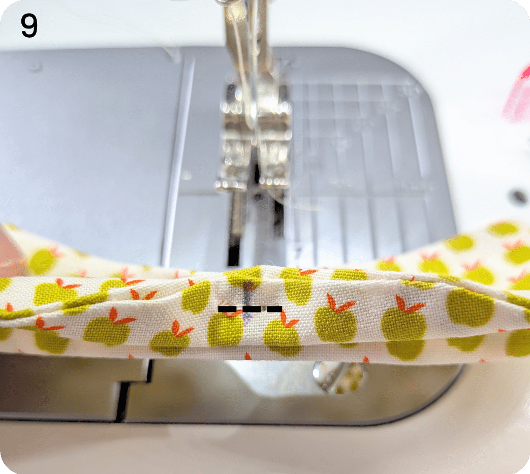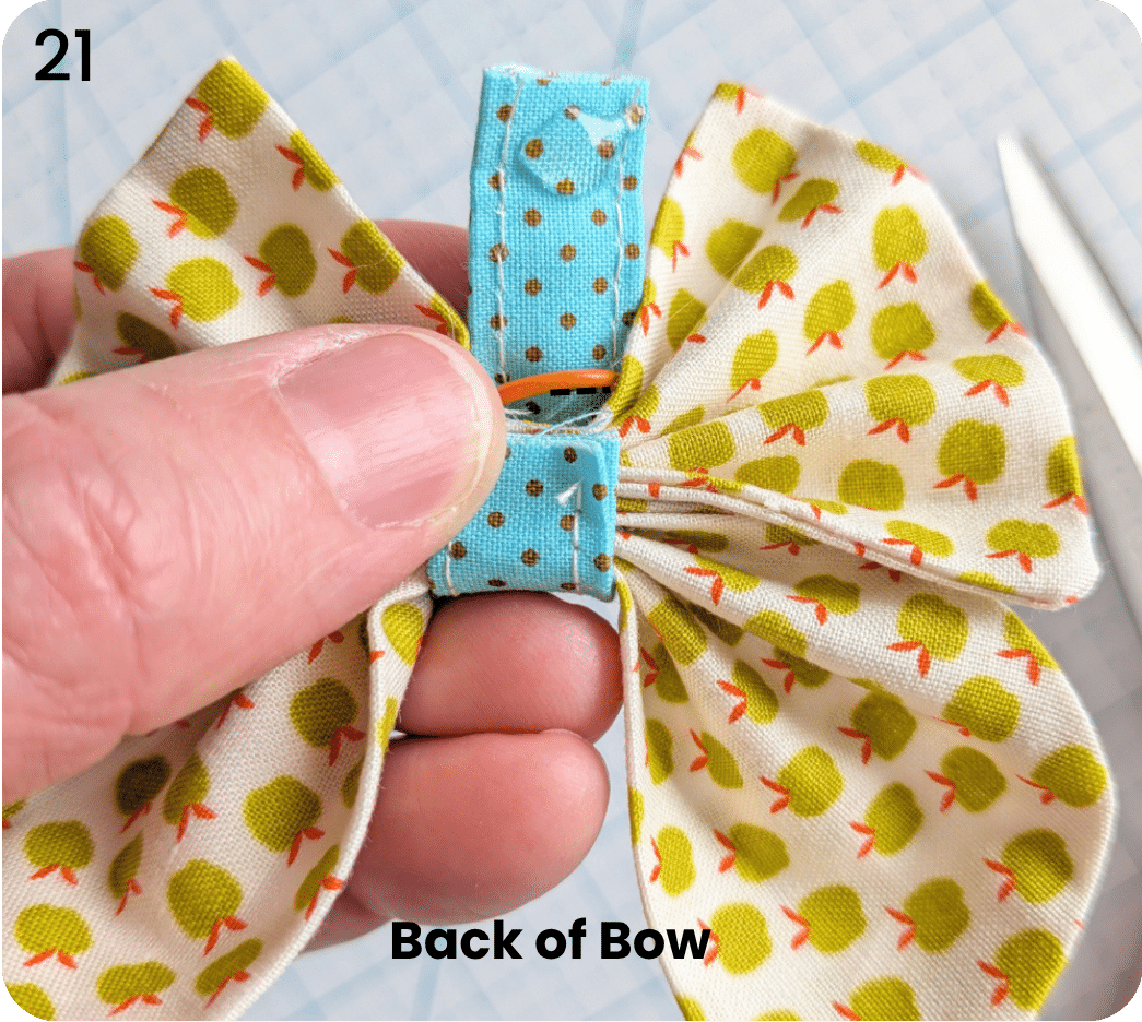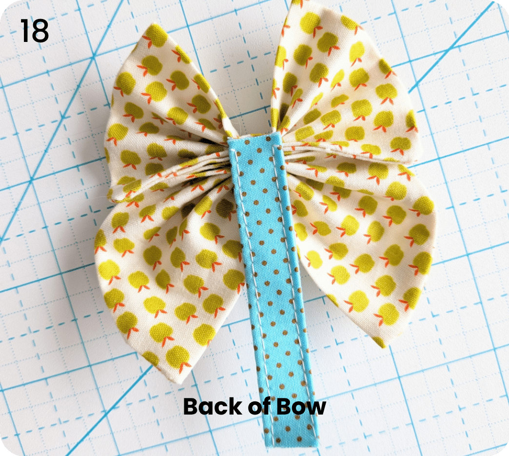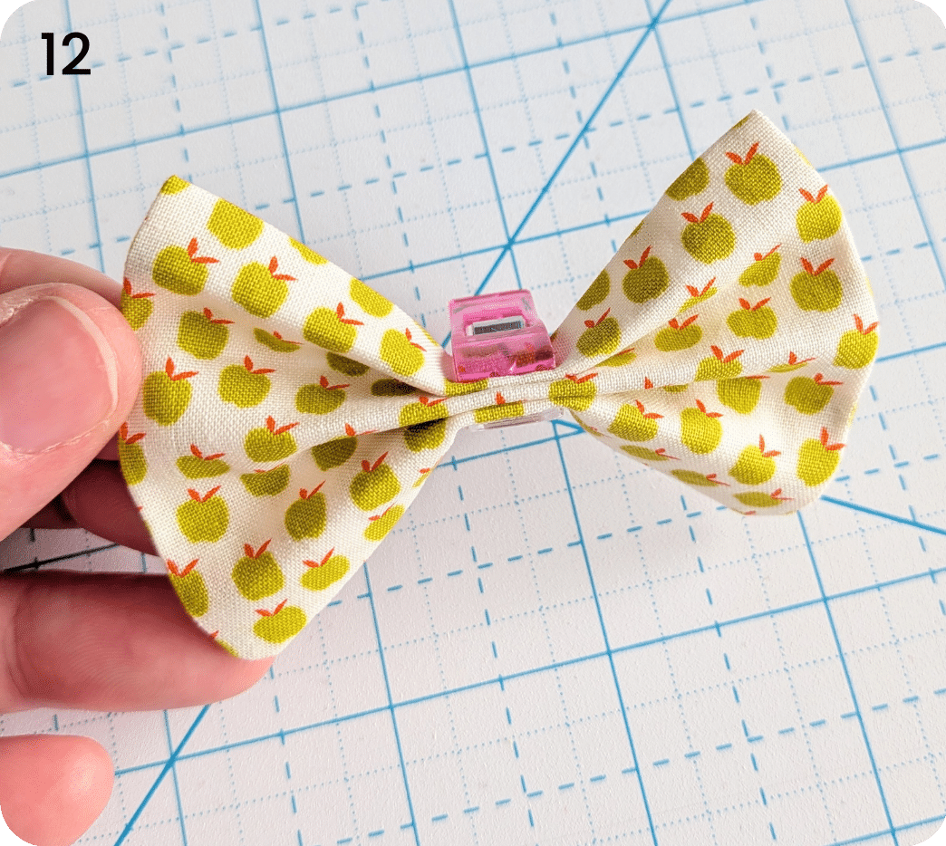 With the center mark on top, bring the Bow Body to your sewing machine and sew a few stitches, securing all the folds in place.