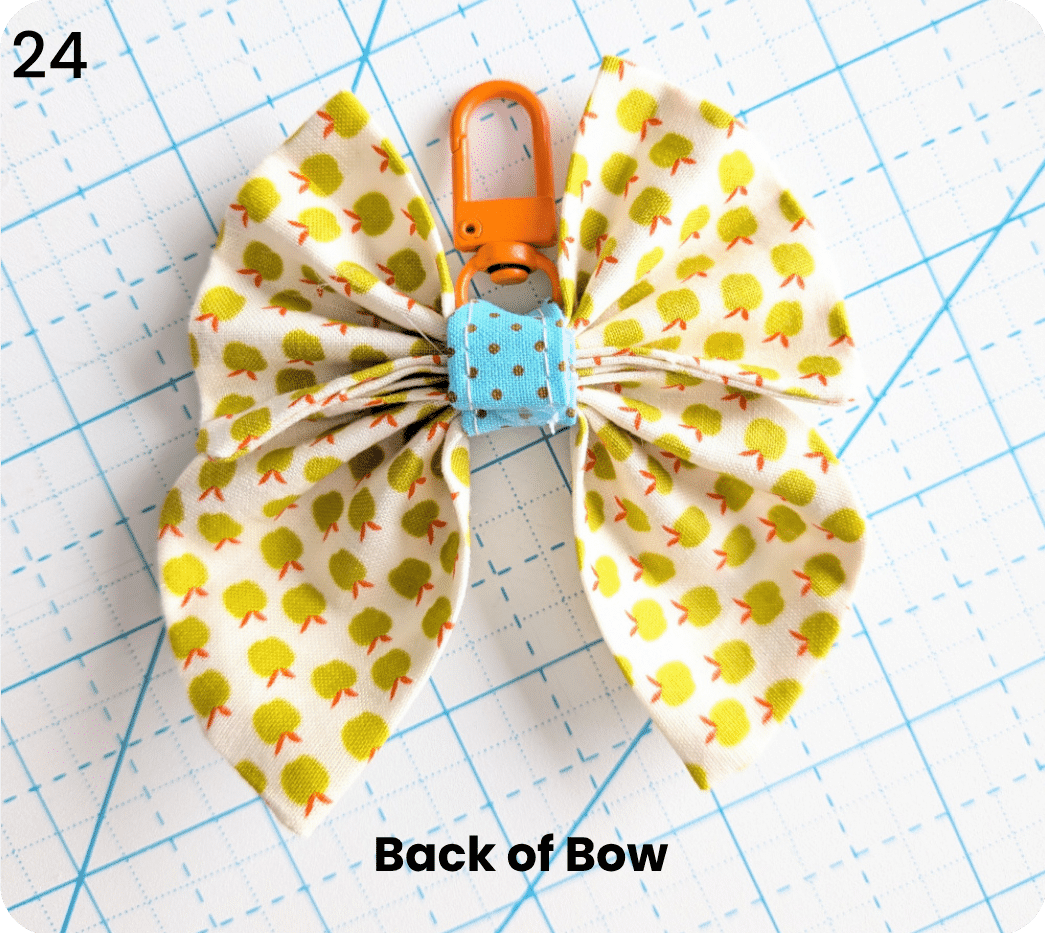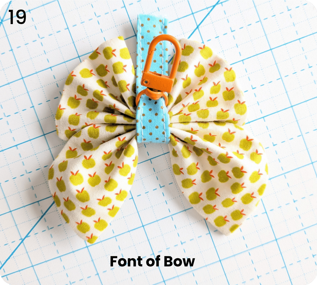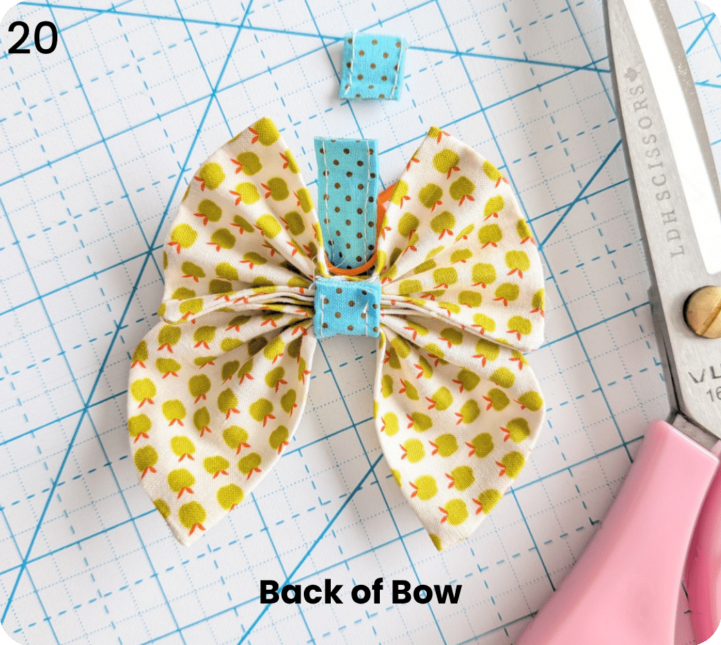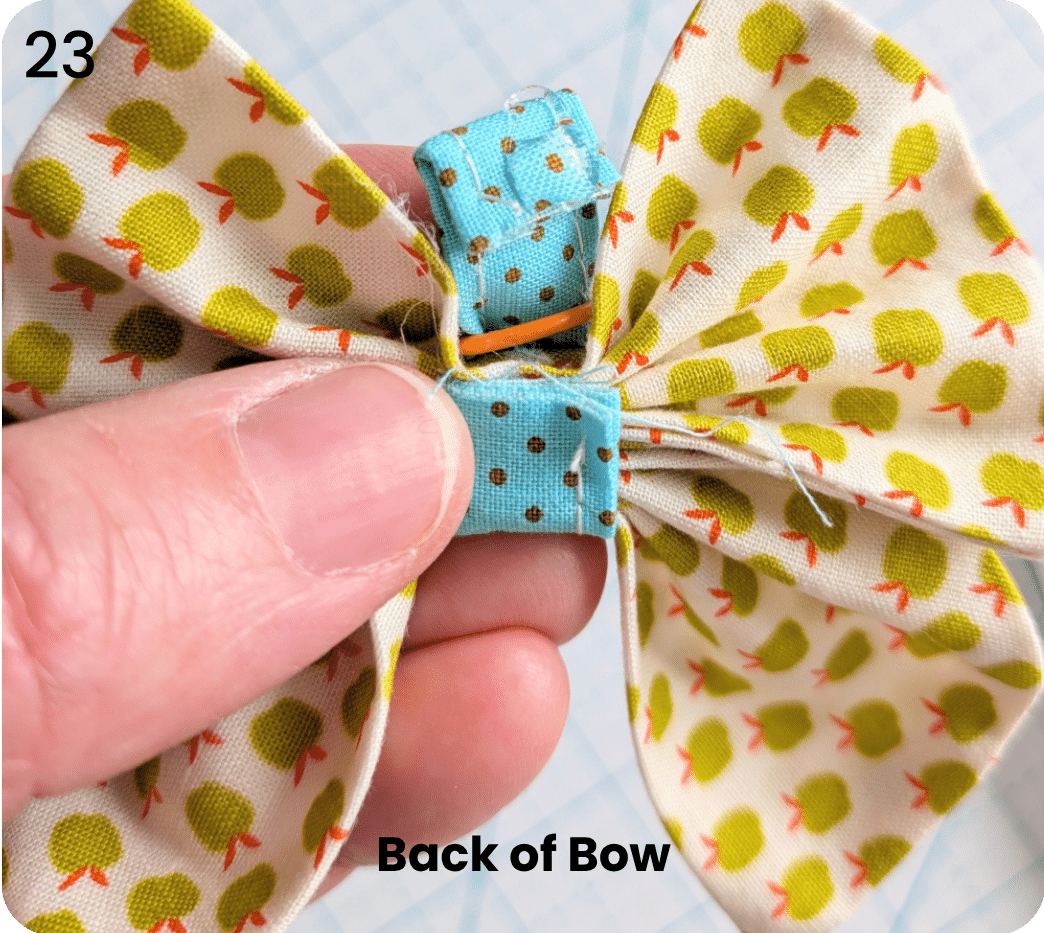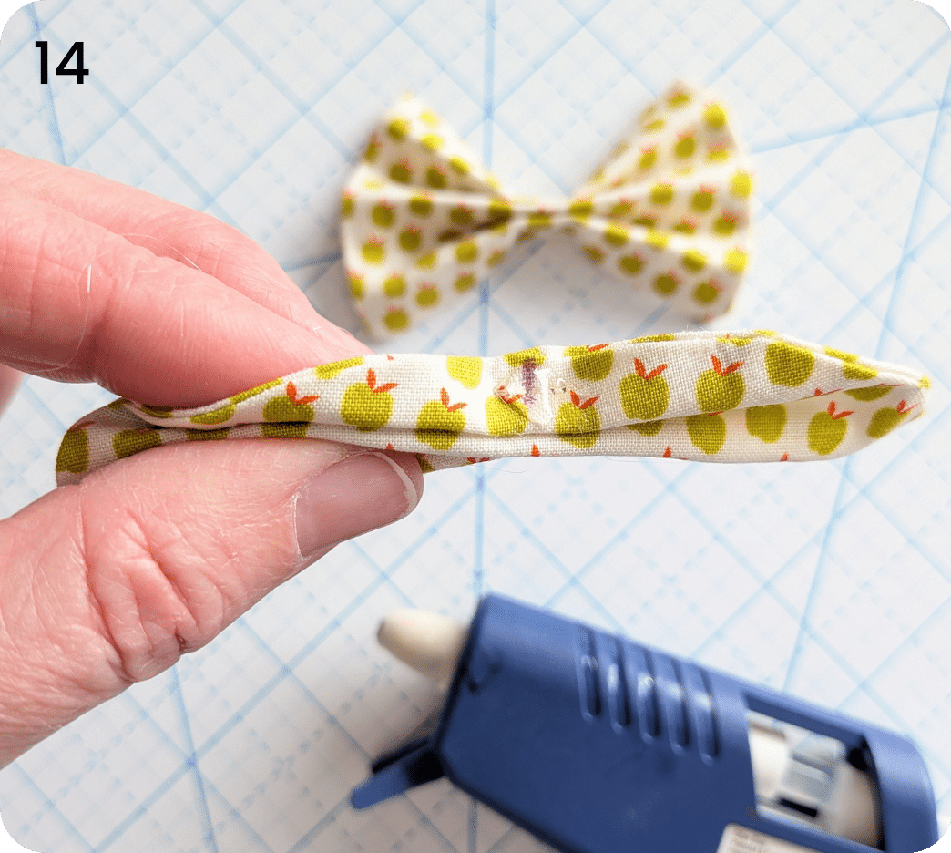 Place a small dab of hot glue on the back side of the Bow (the side with the gaps in stitching) on top of the folds, and press one short end of the Center Tie in place.